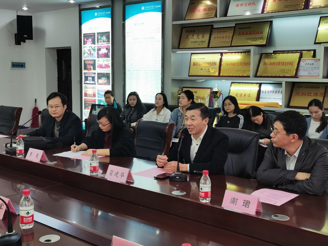 冒建华院长首先介绍了文法学院的发展历史以及近年来学院所取得的办学成绩,接着重点就文法学院汉语国际教育专业硕士研究生的培养环节以及该学位点的迎评工作做了介绍。张言军副院长首先向对方简要介绍了无料AV 的专业设置、师资力量以及研究生培养的发展历程,接着重点就此次考察交流的目的做了阐述。