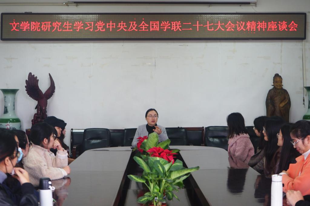 会上,研究生研究生工作秘书刘宁老师对《习近平致全国青联十三届全委会和全国学联二十七大的贺信》和《唱响新时代爱国团结跟党走的青春之歌——在中华全国青年联合会第十三届委员会全体会议和中华全国学生联合会第二十七次代表大会上的致词》这两个文件进行领学与精神研读。刘宁老师强调,广大青年学生要坚定理想信念,勇于开拓创新。坚持跟党走,积极创新实践,做好自身学术,为党和国家事业发展作出贡献。