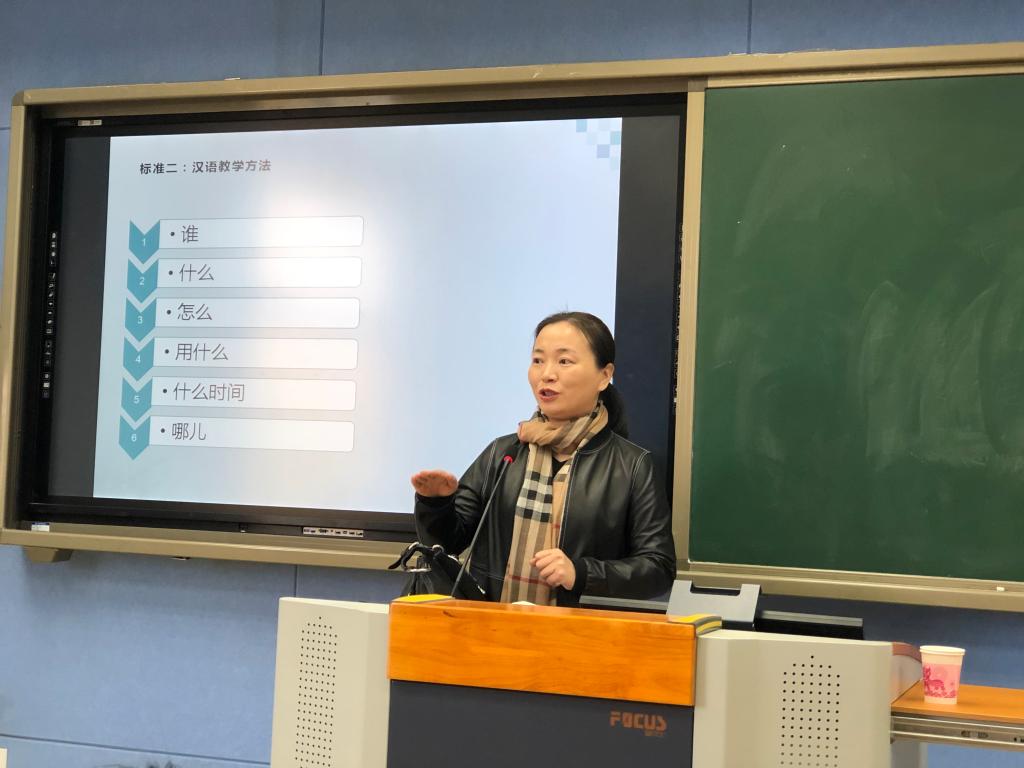 讲座伊始,万教授从国际汉语教师标准切入,结合国际汉语教师应具备的五大能力介绍了汉语教学基础、汉语教学方法、教学组织与管理、中华文化与跨文化交际、职业道德与专业发展等相关内容。接着,万教授对各个方面的具体内容进行了详细阐释,对如何讲解声韵母、声调及语流音变等知识提出了行之有效的方法;她以丰富的海外教学经验为例,为大家提供了解决跨文化交际与课堂管理等棘手问题的新思路。最后,根据同学们所提出的疑问,万教授认真倾听并逐一解答了同学们的困惑。万莹教授丰富的教学经验、温文尔雅的教学风格、不断追求进步的教学态度都给师生留下了深刻的印象。下午,万莹教授还与汉语国际教育专业几位老师一起指导了学生的技能训练。