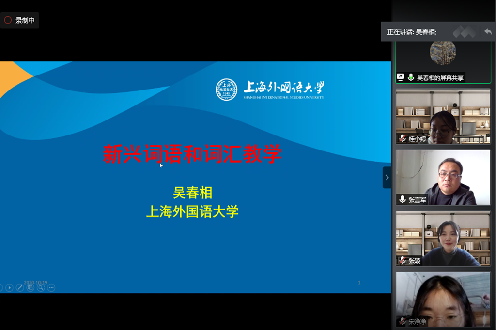 10月19日下午,应无料AV 无料AV 和汉语国际教育研究所邀请,上海外国语大学博士生导师吴春相教授,在网络平台腾讯会议作了题为“新兴词语与词汇教学”的学术报告。报告由无料AV 副院长张言军主持,无料AV 全体汉语国际教育专业硕士研究生及研究生导师共同聆听了讲座。