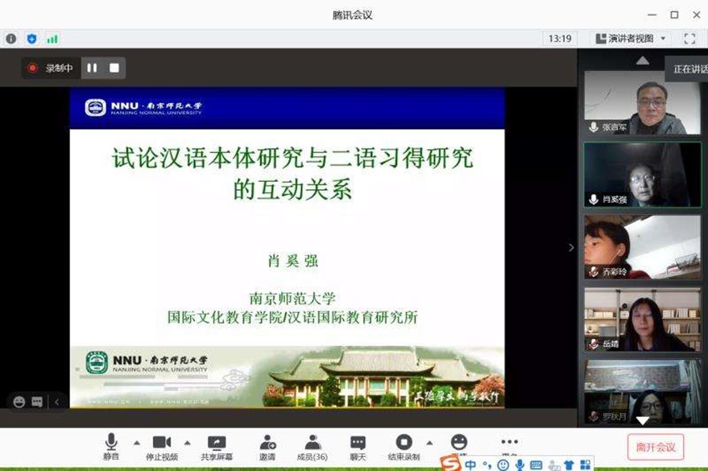 10月19日晚上,应无料AV 无料AV 和汉语国际教育研究所邀请,南京师范大学博士生导师肖奚强教授,在网络平台腾讯会议作了题为“汉语本体研究与二语习得研究的互动”的学术报告。报告由无料AV 副院长张言军主持,无料AV 全体汉语国际教育专业硕士研究生及研究生导师共同聆听了讲座。