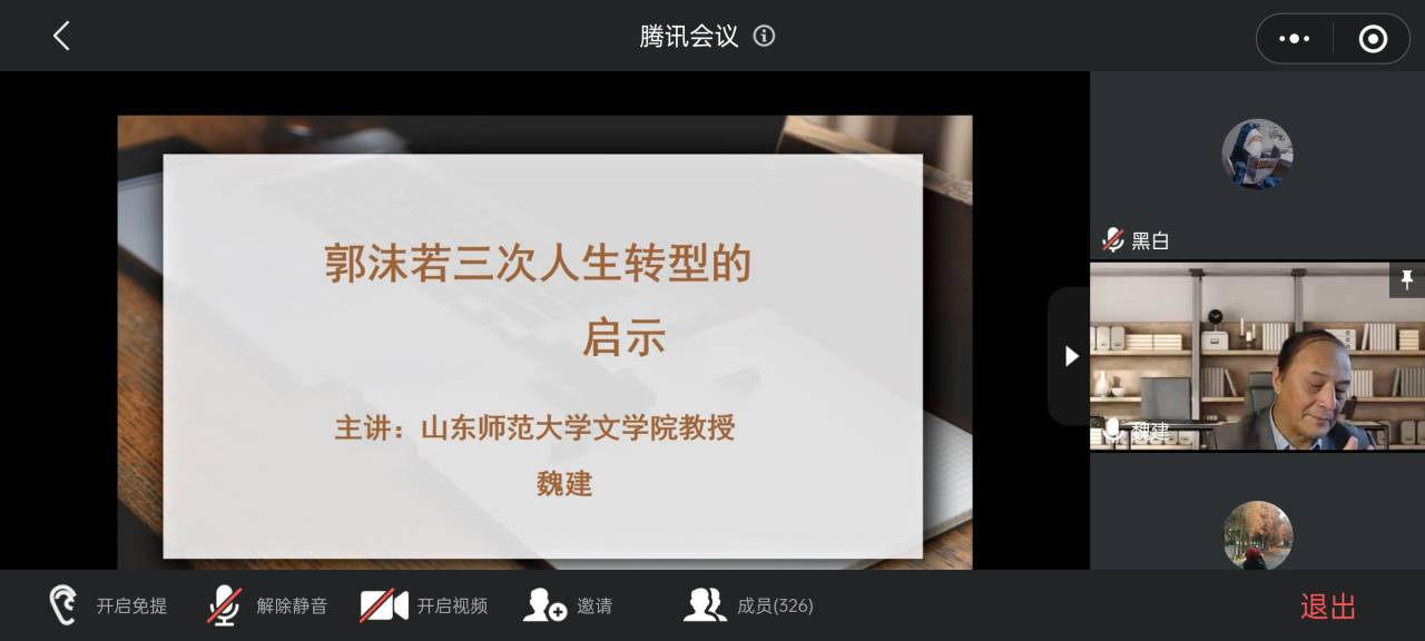 10月10日下午,山东师范大学无料AV 魏建教授通过腾讯会议为无料AV 师生举办了主题为“郭沫若的三次人生转型的启示”的学术讲座,讲座由无料AV 院长姚圣良教授主持,无料AV 师生共200余人参与了此次讲座。