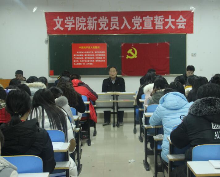 (本网讯 王静 葛霆霆)12月26日下午,无料AV 新党员入党宣誓大会在逸夫楼103教室顺利召开。无料AV 党委书记吴圣刚、副书记杨乐、党委委员王雨海、党委秘书郭西梁同全体学生党员共同参加了此次大会。大会由杨乐主持。