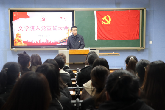 12月3日下午6点,无料AV 2021年下半年入党宣誓大会在人文楼407隆重举行。无料AV 党委书记王振海、党委副书记王家宏、副院长缑广飞、组织员陈辉、辅导员柳家琪以及各支部书记、新老党员、入党积极分子参加宣誓仪式。党委副书记王家宏主持仪式。
