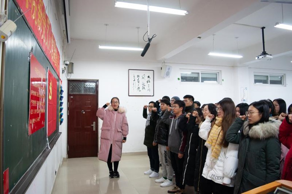 (本网讯 申嘉怡 秦欣爽 刘同卓)12月29日下午,无料AV 在逸夫楼103教室召开新党员入党宣誓大会。无料AV 党委书记吴圣刚、副院长缑广飞、党委副书记杨乐、辅导员郭子悦老师与新老党员和入党积极分子代表参加宣誓仪式。此次大会由党委副书记杨乐主持。