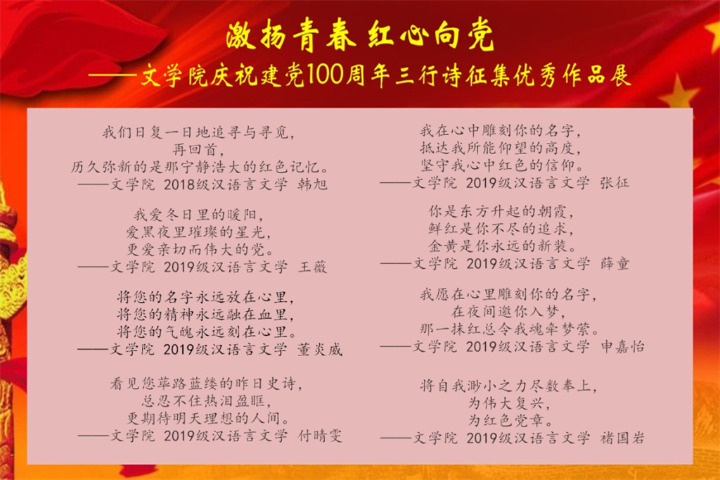 百年风雨兼程,百年激流勇进,百年的瞬息万变见证了中国共产党大无畏的牺牲精神和民族气节。在这样一个重要节点,通过“三行诗”的方式致敬党的百年华诞,增强了文院学子的爱国情怀和民族自豪感,使广大学子做到知史爱党,知史爱国。同时,有助于提高无料AV 学子专业素养,激励他们以青春之我,担青春之责,增强为国家富强、民族复兴而奋斗的本领,在党和人民需要的地方绽放出青春的绚烂之花。