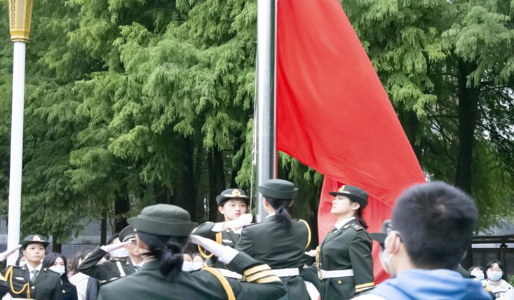 升旗仪式正式开始,国旗护卫队护卫国旗入场,五星红旗伴随着国歌升起,全体师生行注目礼。2021级汉语言文学一班学生赵一嘉作为新生代表进行了主题为“以青春之我,创青春之中国”的演讲,从不同方面来告诉我们青年人是最富有朝气的一代,要勇做立在时代潮头的弄潮儿,为祖国的建设添砖加瓦。随后学生们跟随2020级创写一班王祖晨进行宣誓,重温入团誓词,坚定理想信念。