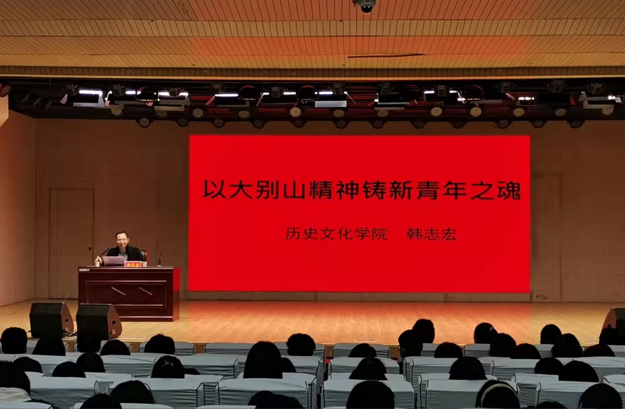 历史与文化学院党委副书记韩志宏从对大别山精神的讲解出发,为大家解读大别山精神“坚守信念,胸怀全局,团结一心,永当前锋”的科学内涵,同时以大别山精神激励当代新青年,坚定理想信念,努力实现自身价值。通过列举革命先烈事迹,指出新青年应做到自主、进步、进取,要志存高远,为实现中华民族伟大复兴贡献自己的一份力量。同时以“以大别山精神,铸新青年之魂”为中心从不同角度进行阐释,指出了新青年坚定理想信念是一个国家前进的动力,大家应勇于担当,珍惜青春韶华,努力矢志奋斗。