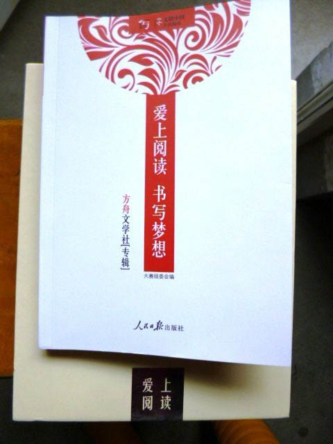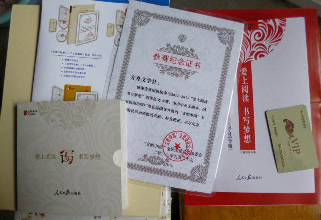 (下图为人民日报为方舟文学社出版的合集以及参赛证书)