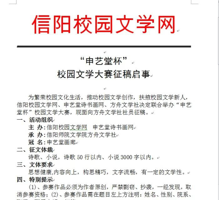 ⑵清源诗社:清源诗社是我社内部的一个特色部门,隶属于方舟文学社。①广泛招纳诗歌爱好者,探讨学习诗歌。②积极筹备开展“诗歌文化节”和“清源杯”诗歌大赛等活动。③每月定期举行清源诗友交流会,邀请清源诗社人员及信阳师院诗歌爱好者共同讨论诗歌。④定期邀请信阳市浉河区作协人员举行讲座,促进校园诗歌发展。
