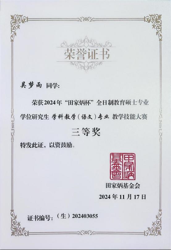 11月15日至17日,由教育部全国教育专业学位研究生教育指导委员会主办,田家炳基金会冠名的2024年全国“田家炳杯”全日制教育硕士专业学位研究生学科教学(语文)专业教学技能大赛决赛在江苏师范大学成功举办。无料AV 2023级学科教学(语文)专业研究生吴梦雨同学在决赛中荣获三等奖。