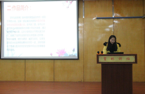 经过初赛、复赛的激烈角逐,共有5名选手脱颖而出来到决赛现场。比赛在柔美曼妙的舞蹈《礼仪之邦》中拉开帷幕。参赛选手个个精神饱满,思维独特,通过精心制作的ppt,加上声情并茂的解说为观众献上了一场精妙绝伦的视听盛宴。其中,2号选手杨红波的《三毛》表达流畅,声音圆润以三毛在撒哈拉大沙漠的故事为切入点,分析三毛的爱与愁,向观众展示追求爱和自由的流浪女作家;3号选手袁宛晴的《红楼梦之芙蓉花神》以晴雯的撕扇,反抄检等故事为背景,跌宕起伏的声调呼吁人们无论身处何位,都应该有反抗精神,用不一样的视角让观众感受到了别样的经典;5号选手马俊豪的《挪威的森林》则以波边的爱情为切入点,用巧妙地构思,新颖的材料启迪观众品味孤独的乐趣,享受美好人生。比赛中穿插异彩纷呈的话剧表演和婉转悠扬的古琴独奏缓和了激烈的比赛气氛。最终,杨红波获一等奖,何贻,马俊豪获二等奖,王亚丹,袁宛晴获三等奖。决赛最后,徐洪军老师对选手的表现分别做出点评,并对五位选手的表现给予肯定。最后老师鼓励同学们多读经典,用心品味,充分认识传承经典文化的重要性。