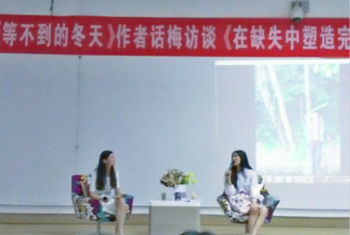 此次访谈以“《在缺失中塑造完整》”为主题,以用轻松的对话方式阐明生活、写作与梦想等方面的新颖、独到理念。首先,话梅指出写作需要灵感,在写作中遇到瓶颈时会去追雨,将自己融入雨滴和湖面之中,用全身心与自然碰撞的方式来寻找灵感。接着她从角色与定位、作品与生活、技巧与建议等方面介绍写作心得。其中,在作品与生活的讨论环节,她强调拥有梦想的重要性,希望同学们养成好的阅读习惯,因为阅读可以改变一个人的相貌与气质,将自己澄澈向阳的一面展露出来。最后,在互动环节,同学们积极踊跃,现场气氛热烈,话梅的幽默、风趣作答赢得在场观众阵阵掌声。访谈结束后,话梅热情与学子亲切交谈,并签名赠书。
