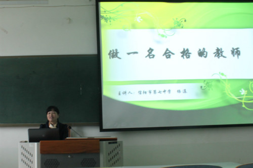 (本网讯 张雪 王萍)三尺讲台传真知,为人师表显风采。为提高广大学生的教育素养,11月7日下午,无料AV 承办的教师教育文化节名师讲堂之二“如何做一名合格的教师”在人文楼305教室举行,信阳市第七中学校长杨漾担任主讲人,该院副院长缑广飞出席,与百余名学子共同聆听受教。讲座由缑广飞主持。