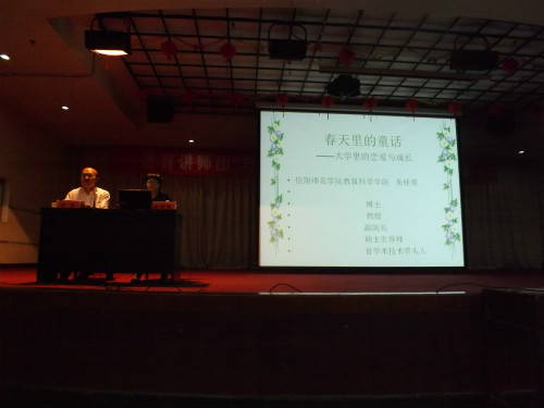 大会伊始,朱桂琴以一个心理小测试引入“爱情”的话题。她分别从“心理学视角下的爱情、大学生恋爱的现状、常见困惑及对策”三个方面深入分析了大学生“恋爱与成长”的关系,并指出正确处理恋爱关系对大学生的重要性。就当前社会的恋爱状况,她引用斯滕伯格“恋爱、亲情、承诺” 的爱情三元素理论,创造性地提出了爱情观中的“一个中心”、“两个基本点”和“四项基本原则”。她强调大学生恋爱应以“情投意合”为中心,坚持“从一而终、宁缺毋滥”两个基本点,坚持新时代下“门当户对、真情投入、两厢情愿、长期相处”四项基本原则。她诙谐幽默的语言,独特精辟的见解及其超强的亲和力、感染力,使现场气氛不断高涨,赢得观众的阵阵掌声。接着,她关于有效解决大学生恋爱之“必修课与选修课、小天地与大世界、学业与爱情、学得好与嫁得好”四种困惑,详细做了解答,告诫同学们恋爱双方要懂得沟通与理解、支持与照顾、遵守恋爱道德,希望他们在恋爱中保持人格独立、学会尊重他人、自觉承担责任、讲究举止文明。之后,徐忠做最后的总结发言,报告会取得圆满成功。
