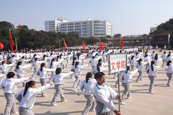 (本网讯 李宝丽)一拳一式彰显青春风采,弓步马步展现学子风貌。9月21日下午,信阳师院2014级新生军体拳比赛在青年广场隆重举行,来自各院系的19支参赛队齐聚于此。学校相关领导和军训承训部队首长担任大赛评委。
