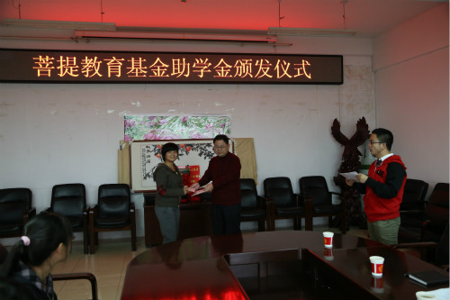 (本网讯 高笑蕊)10月24日下午,受美国菩提教育基金会创始人李祖鹄先生的委托,该基金会义工、新华社河南分社记者李金红先生来到无料AV ,将2.1万余元善款送到了无料AV 18名菩提教育基金助学金获得者手中。校学生处处长岳宗德、无料AV 副院长张振龙、缑广飞、党总支副书记白献林等领导老师出席了助学金颁发仪式。