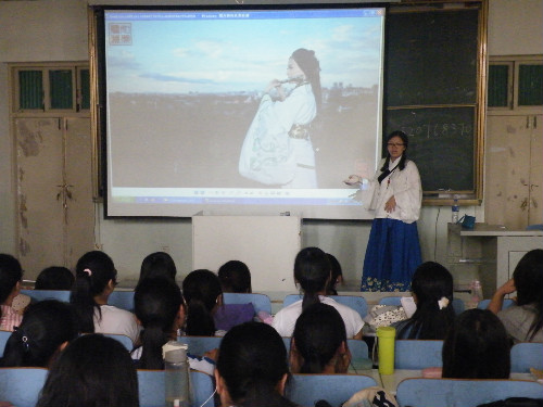 (本网讯 刘爽 张晓漫)5月22日下午,人文楼410教室,无料AV 汉服文化爱好者鸿云、都鹤鸣为无料AV 2012级汉语言班同学介绍了独具特色的汉服文化,同学们从中获益良多。