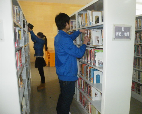 在图书馆工作人员的安排下,志愿者们先对图书馆内书籍的分类和编号有了大致了解。随即开始分工协作,将杂乱的图书按照书架上的指定位置码齐码好,摆放整齐。由于图书馆每天的人流量都很大,尽管图书馆在分类上清晰,共有少儿、成人、杂志等图书阅览室,而且在每个阅览室中,也大都按书籍种类分别上架,但实际情况却是不少书籍悄然“串门”,摆放混乱。有些读者图自己方便省事,看完书之后直接把书放桌子上或放在借书池里。面对这种情况,志愿者们没有丝毫抱怨,充分发挥无私奉献的雷锋精神,不怕苦,不怕累,尽心尽力的贡献自己的一份力量。
