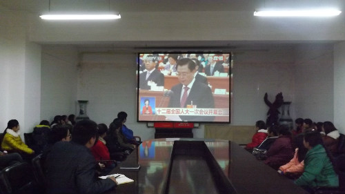 (本网讯 岳楠)3月5日上午9时,中华人民共和国第十二届全国大一次会议在人民大会堂隆重召开。为了响应国家号召,加强大学生的政治素养,提高大学生社会意识,信阳师范学院无料AV 于该日上午组织师生收看了第十二届全国人民代表大会第一次会议开幕式,同时系院团委组织学生通过电视、网络、广播也认真听取了温家宝总理代表国务院做的《政府工作报告》。