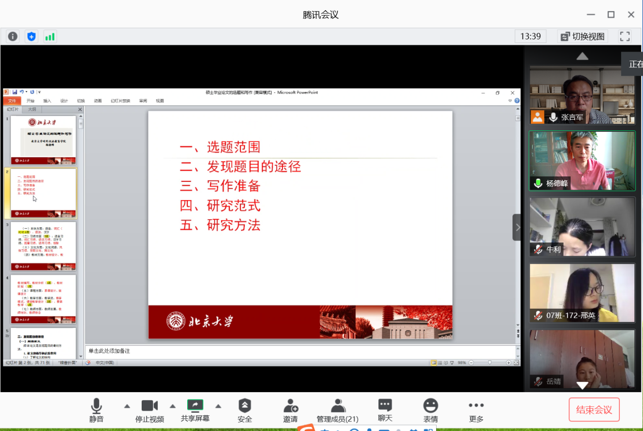 6月10日下午,应无料AV 和汉语国际教育研究所邀请,北京大学对外汉语教育学院博士生导师杨德峰教授,在网络平台腾讯会议作了题为“汉语国际教育专业硕士毕业论文的选题和写作”的学术报告。报告由无料AV 副院长张言军主持。无料AV 全体汉语国际教育专业学位硕士研究生及研究生导师共同聆听了讲座。