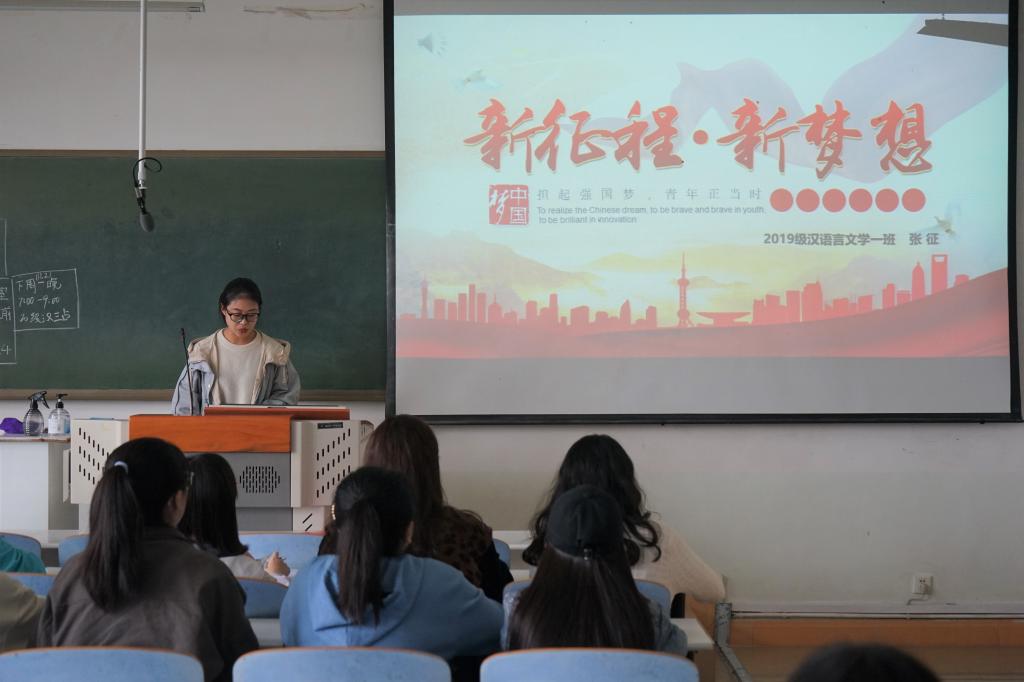 2020级汉语国际教育班团支书刘珊用饱满的情感从“信念情怀——祖国是最深切的热爱”以及“大海与浪花——洪流中的平凡人”两部分来进行团课讲解,层次分明,主题突出,赢得了阵阵掌声。2019级汉语言文学一班团支书张征从党的十九大会议主要内容出发,强调“新征程、新梦想、我们一直在路上、我们都是追梦人”等内容,引起了学生的共鸣,激发了学生“奋进新时代,与祖国共命运”的信心与决心。2019级汉语言文学四班团支书薛英英以“我与祖国共命运——讲疫议故事,做奋进青年”为主题,通过讲述我们身边的平凡人的战役故事展现了青年人在祖国有难时的担当与情怀,其流利的表达、深情的讲述,加之抑扬顿挫的语调,让人心潮澎湃。最后,她还提出:“广大青年应该在为人民服务中茁壮成长,在艰苦奋斗中砥砺前行,在实践中增长工作本领,让青春在党和人民最需要的地方绽放绚丽之花。”赢得了在场观众的喝彩。