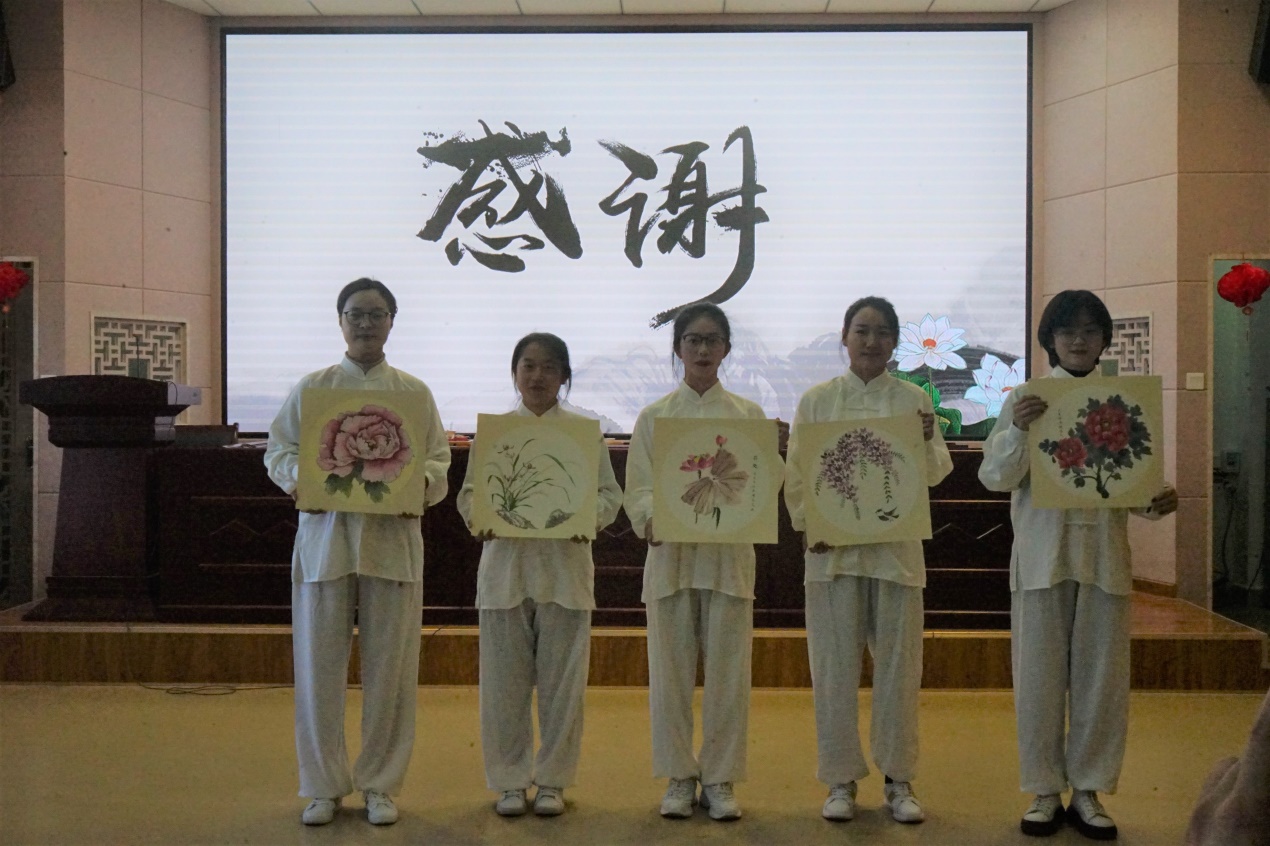 第二个节目为优秀书画作品展示,同学们不仅展示了隶书、楷书等书法作品,还展示了牡丹、紫藤等工笔画。