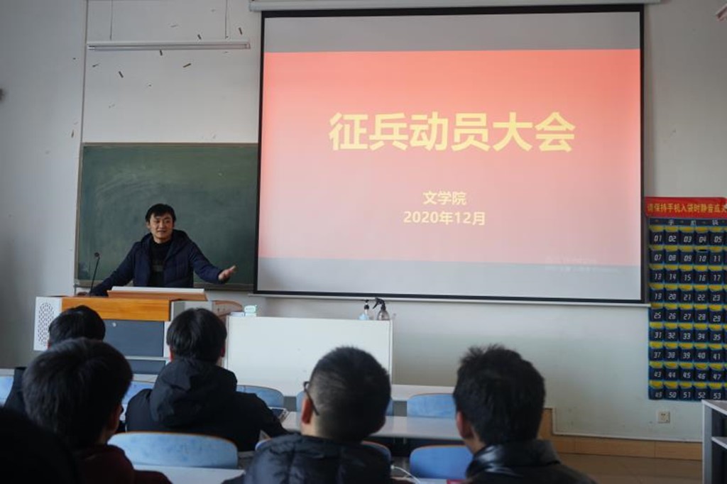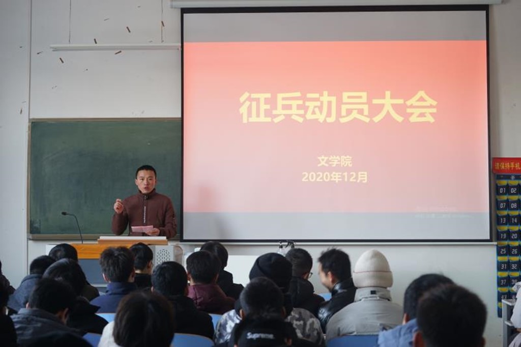 (本网讯 焦蒙蒙 秦欣爽 李雪莹)为响应国家和学校号召,提高兵源质量,促进国防现代化,推动军队科学发展,全面提升大学生综合素质,实现富国强军。12月31号中午,由无料AV 举办的“动员征兵大会”在人文楼107教室成功举办。本次活动由无料AV 武装部老师陈辉主持, 2018级退役士兵王宝留以及无料AV 全体男生参加此次大会。
