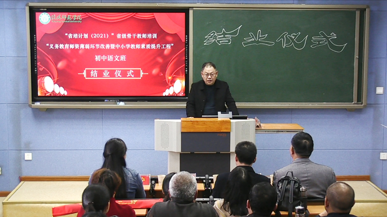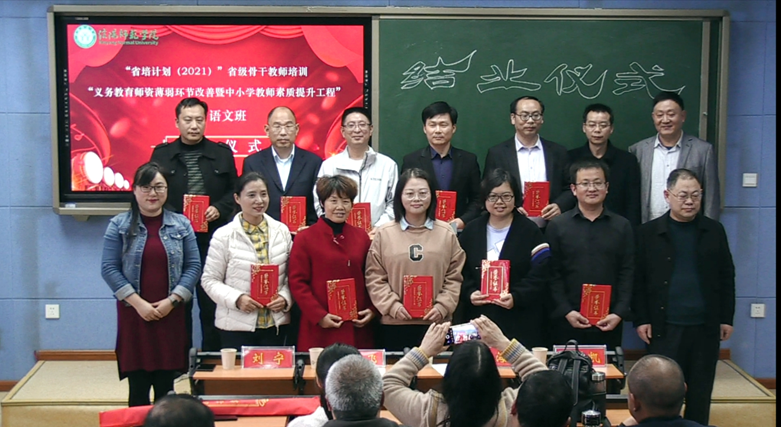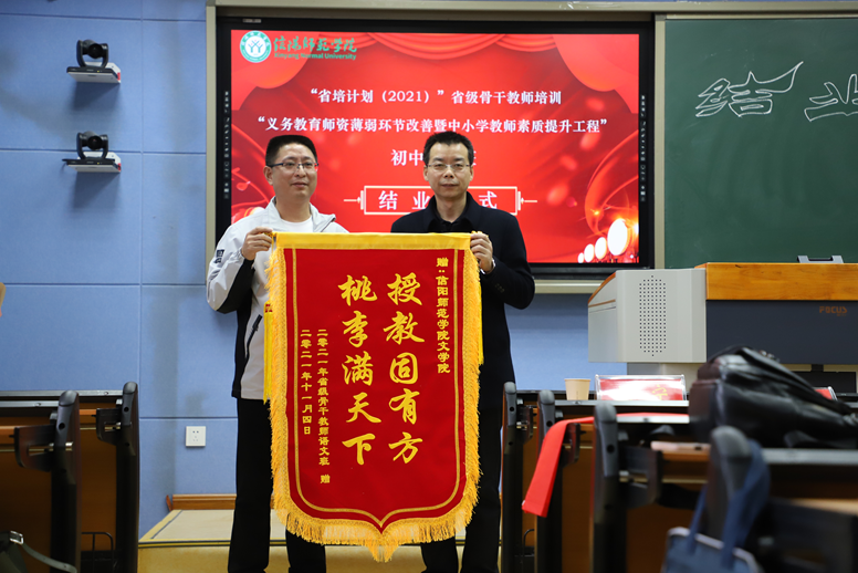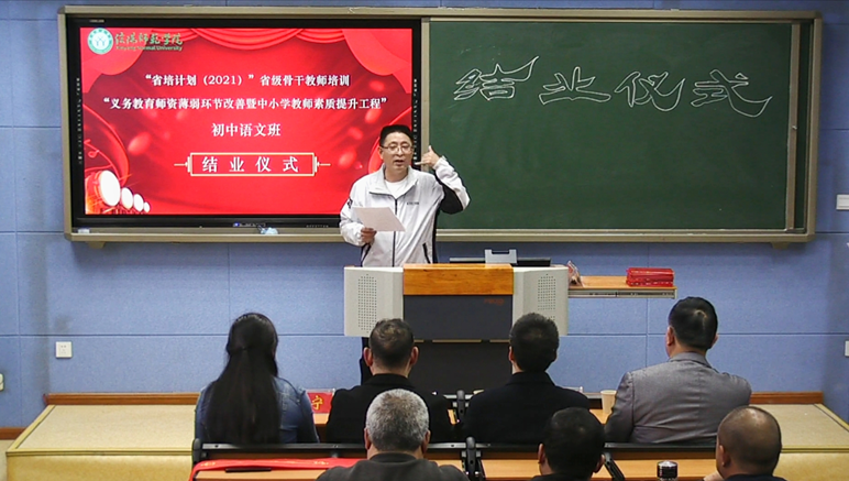 11月4日下午,信阳师范学院无料AV 2021“省培计划”初中语文班结业仪式暨学员答谢会在人文楼407顺利举行。本次结业仪式由初中语文班班长吴东峰主持,出席领导有无料AV 党委书记王振海、无料AV 教学副院长缑广飞、培训项目首席专家杨传凯及培训项目班主任刘宁。
