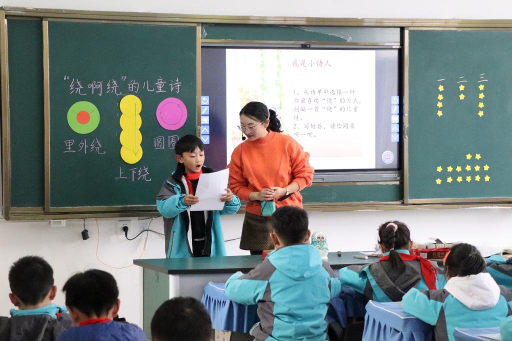 老师们在胜利路学校优秀教师陈霞带领下,和学生们一起学习了一节精彩的示范课《“绕啊绕”的儿童诗》。陈老师引导学生分组学习,运用了多种朗读方式,如自由读、男女读、配乐读、“开火车”读、小组赛读和全班齐读等,并采用奖励棒棒星的方式来鼓励孩子们踊跃回答问题,极大地调动了同学们的学习积极性。活跃的课堂氛围,积极的师生互动,都得到了国培学员的好评。