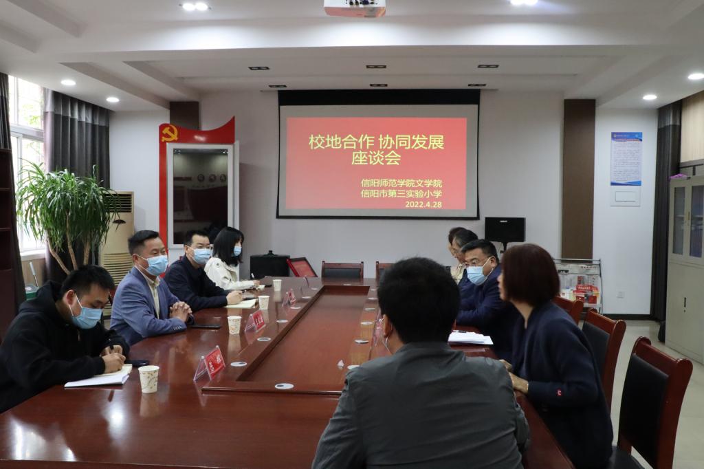 4月28日上午,无料AV 党委书记王振海、副书记王家宏带队走访了信阳市第三实验小学,与校长王建新、书记杨新红就进一步加强“校地合作,协同发展”事宜进行了深入交流。学院就业秘书陈辉、毕业生班主任柳家琪及第三小学相关负责人参加了座谈活动。