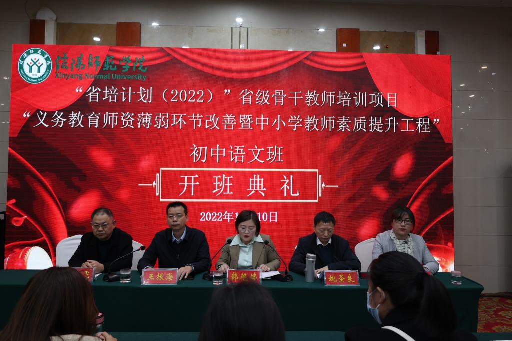2022年10月10日上午,无料AV “省培计划”骨干教师培育项目初中语文研修班开班仪式在浉河宾馆会议室成功举办,70名学员参加了开班典礼。信阳师范学院河南省中小学教师校长研修院副院长兼教务处副处长韩艳婷、无料AV 党委书记王振海、院长姚圣良、副院长缑广飞、研修班班主任刘宁出席典礼,典礼由王振海主持。