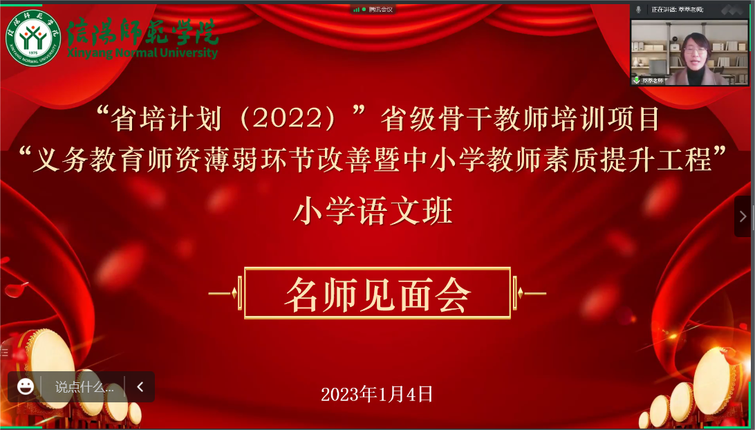 1月4日上午,无料AV 线上举办了2022年“省培计划”小学语文班名师见面会。信阳师范学院无料AV 教研室主任、省培项目首席专家王萃萃及名师网络工作室16位名师出席本次会议,会议由省培项目班主任刘宁主持。
