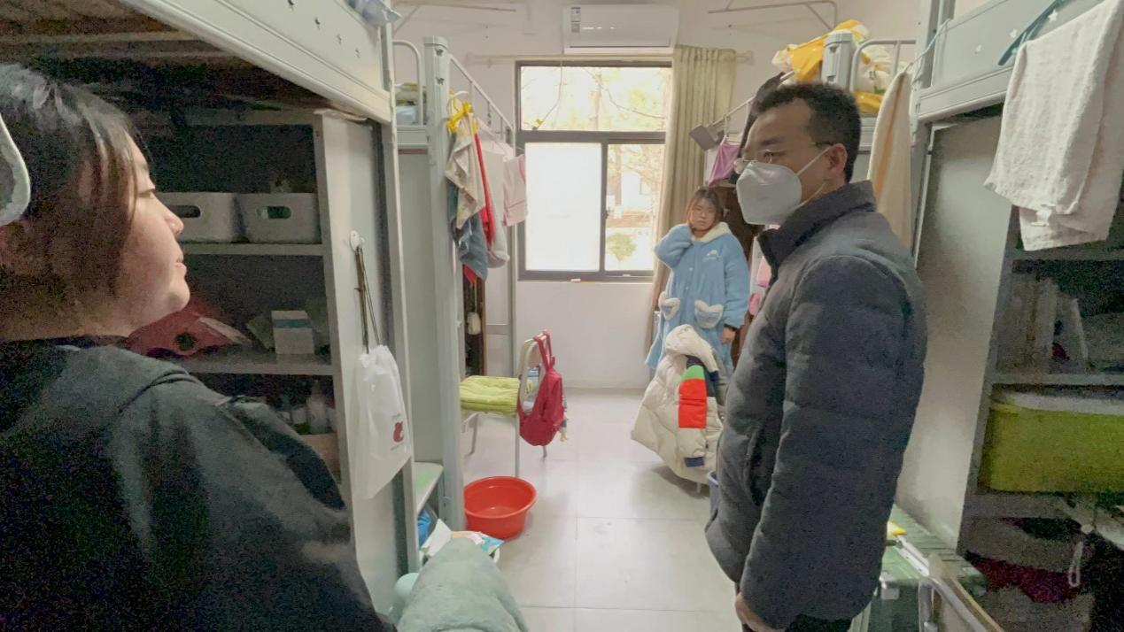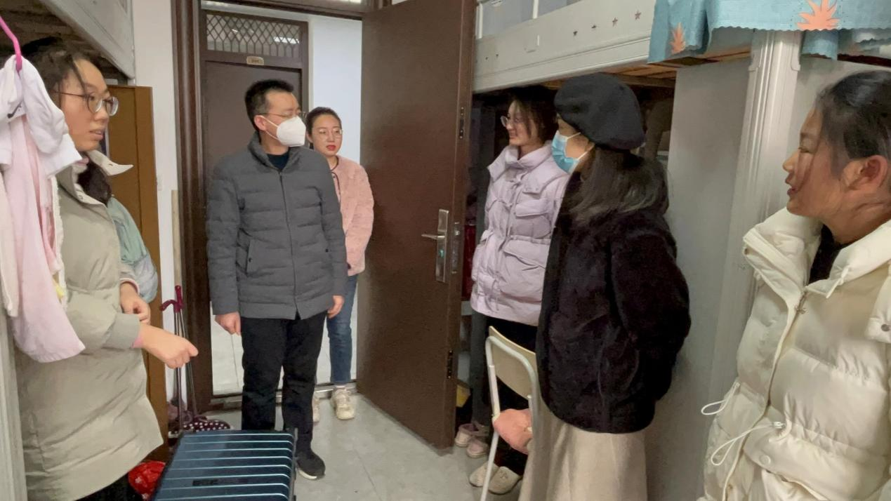 走访过程中,王振海书记首先查看了宿舍的各类设施。在此,王振海书记指出:安全第一,要确保同学们在校的住宿安全。随后王振海书记亲切地和同学们交流,了解学生假期状态及新学期计划,在叮嘱学生的同时又鼓励学生在新学期继续坚持理想、努力学习、夯实基础,在挑战自我中不断成长。最后,王书记还提出,如今疫情防控仍然不可松懈,做好自我防护必不可少,希望同学们出行戴好口罩,保证自身安全。同学们备受鼓舞,对领导老师们的关切表示感谢,纷纷表示在新的一年继续奋斗,学好专业知识,不断提升自我。