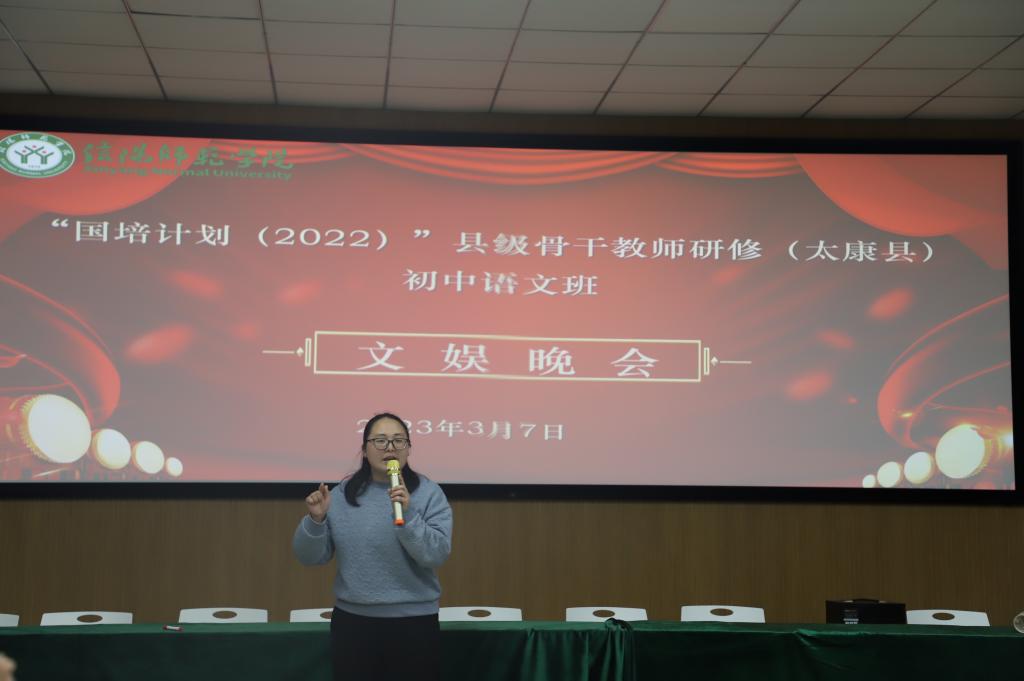 3月7日晚,“国培计划(2022)”太康县项目县级骨干教师初中语文研修班文娱晚会在社科楼120室顺利举行。晚会由文娱委员王子路主持,培训学员、班主任及学生助理欢聚一堂,共同参与并观看此次晚会。