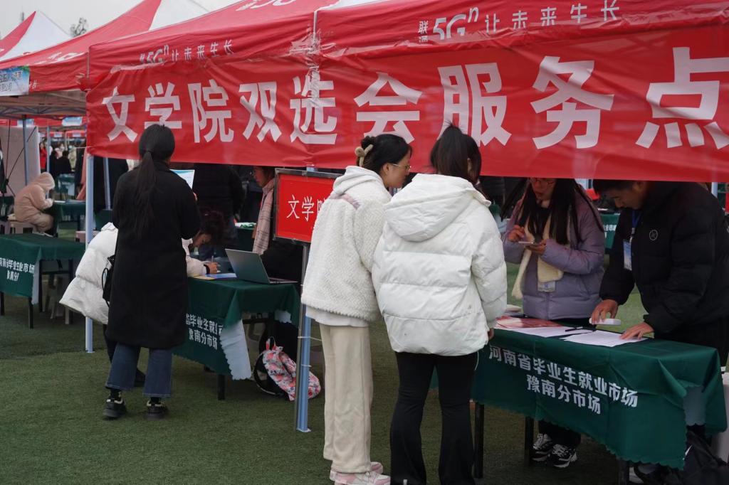 11月25日,河南省毕业生就业市场豫南分市场暨无料AV 2024届毕业生冬季双向选择洽谈会在西操举行。党委副书记王家宏、辅导员柳家琪莅临现场,指导毕业生做好就业工作。